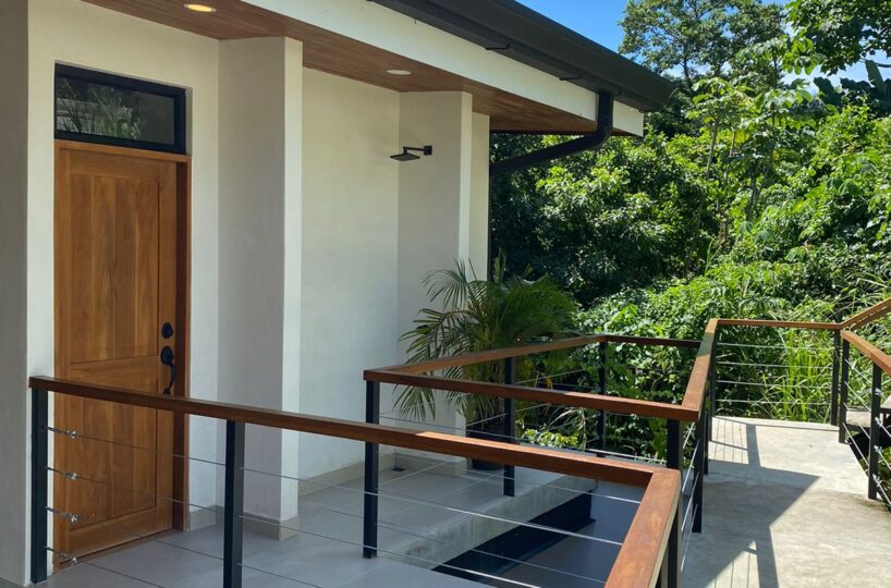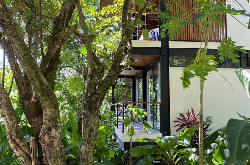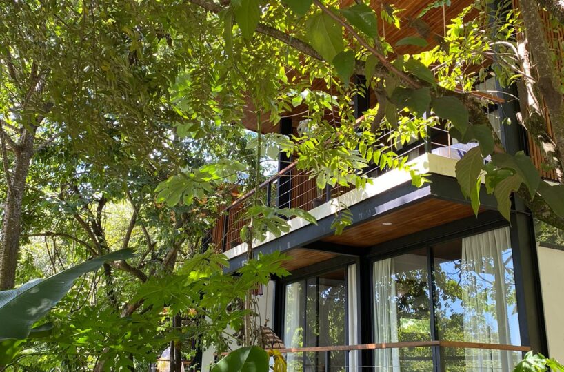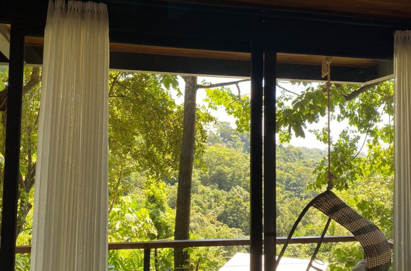 This spacious room can be said to function as a studio as well. It has a double bed, an open bathroom overlooking the jungle, kitchen and also living area with a single sofa bed. The primary has two air conditioners strategically located to ensure comfort. In addition to everything mentioned it has a large terrace with a hanging bed, where you can enjoy the relaxing jungle & peak-a-boo ocean views.