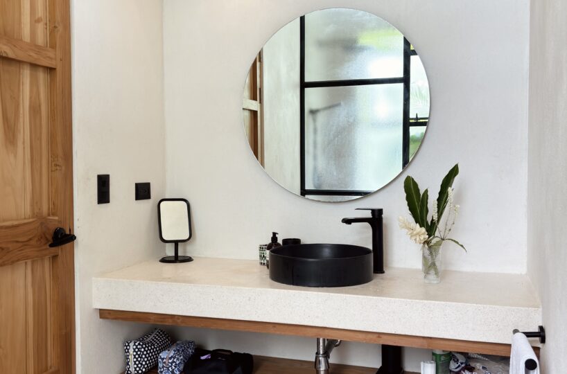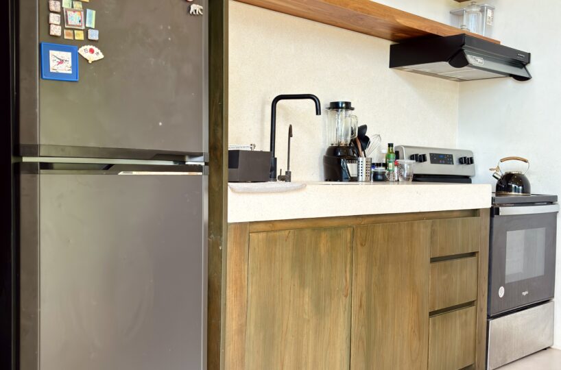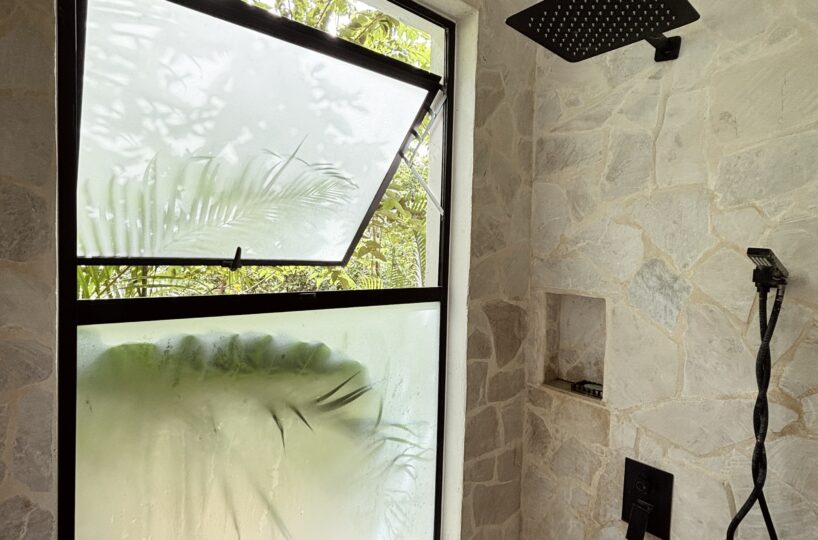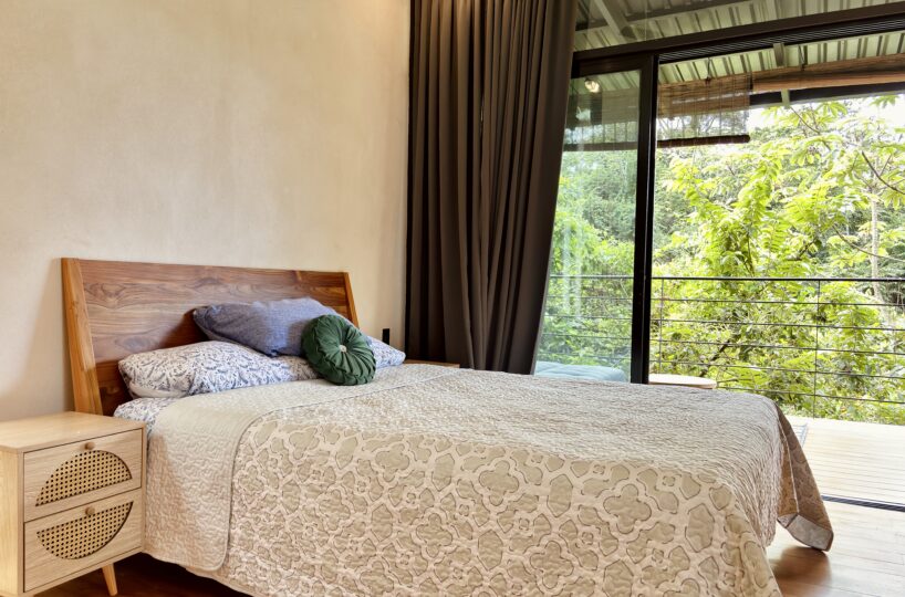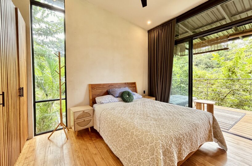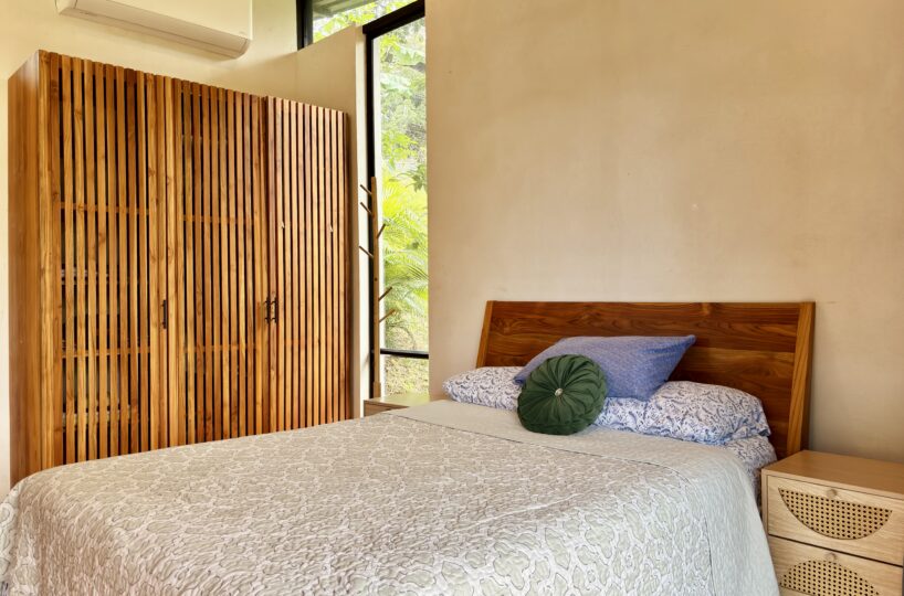 The home is warm and inviting. Upon entering, you’ll find a fully equipped kitchen that flows seamlessly into the living area. Large windows throughout the space frame stunning valley views, filling the home with natural light. A wooden partition separates the bedroom, which features air conditioning, expansive windows with beautiful views, and a generous built-in closet. The bedroom includes a comfortable en-suite bathroom, thoughtfully designed for everyday convenience.