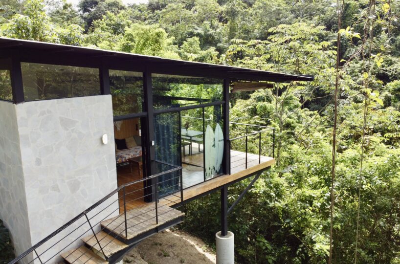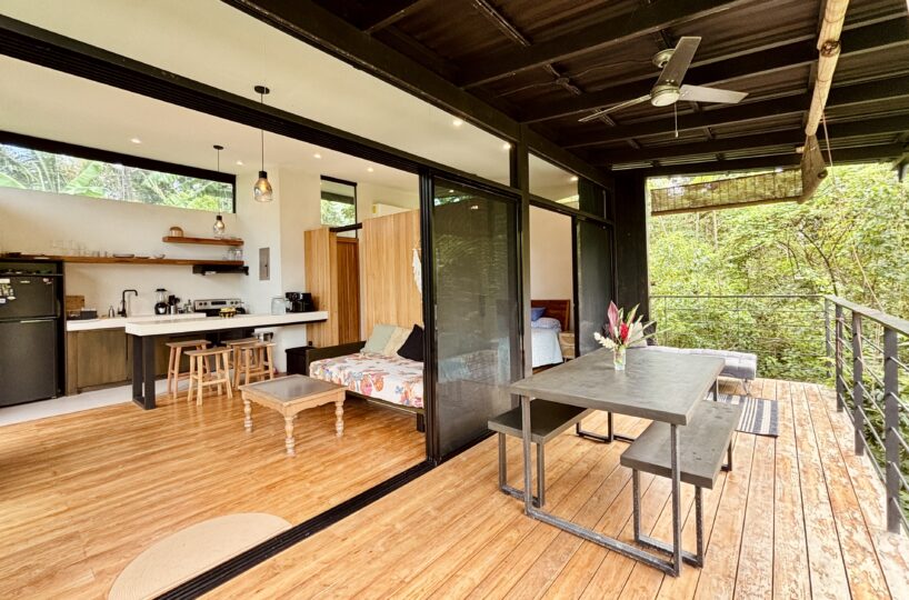 Both the living area and bedroom open onto a balcony surrounded by lush greenery, offering a tranquil setting to relax and enjoy the natural surroundings.