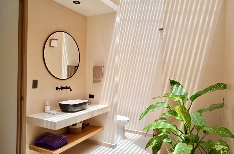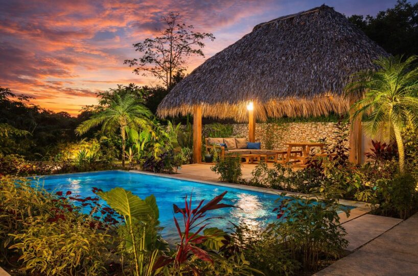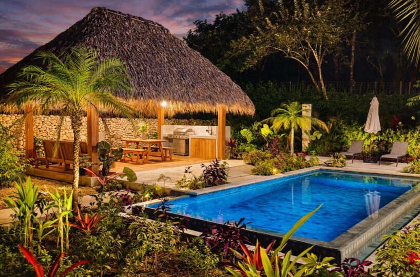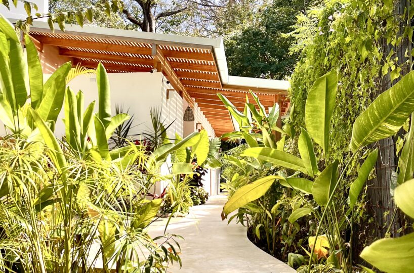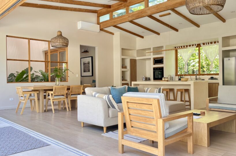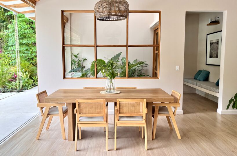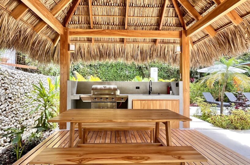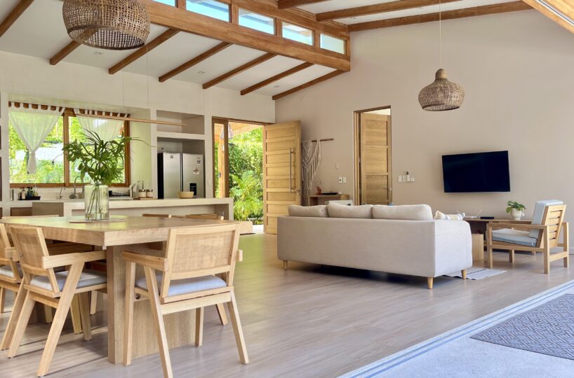 The existing home offers a total of 291 m² of construction, including terraces and pool areas, and is designed to maximize natural light and indoor/outdoor living. The open-concept kitchen and living area flows onto the outdoor terrace through large glass doors, creating a seamless transition to the swimming pool, which is finished in elegant Sukabumi tiles and surrounded by beautifully landscaped tropical gardens. Adjacent to the pool, a covered rancho with a BBQ provides the perfect setting for outdoor dining, entertaining, or simply relaxing in the shade.