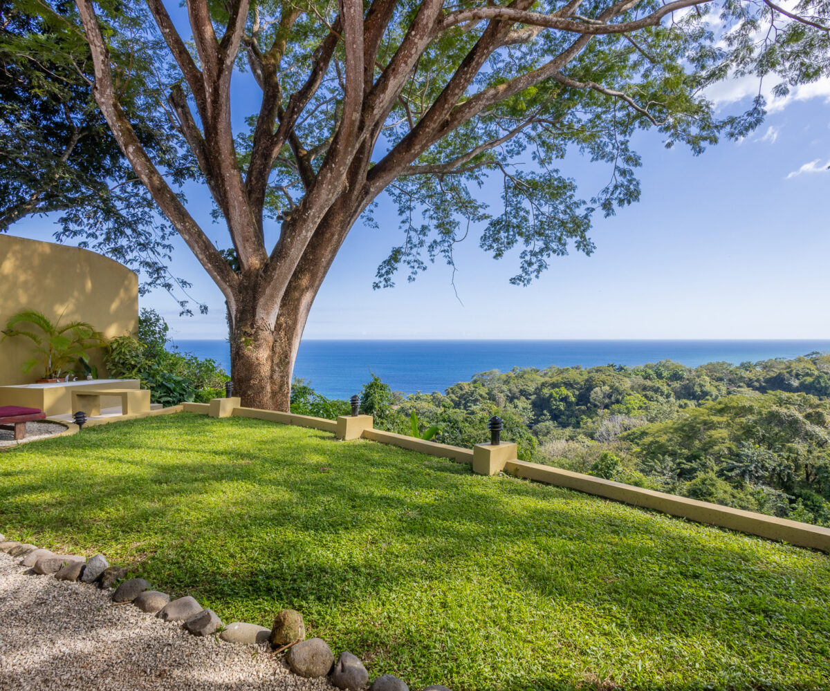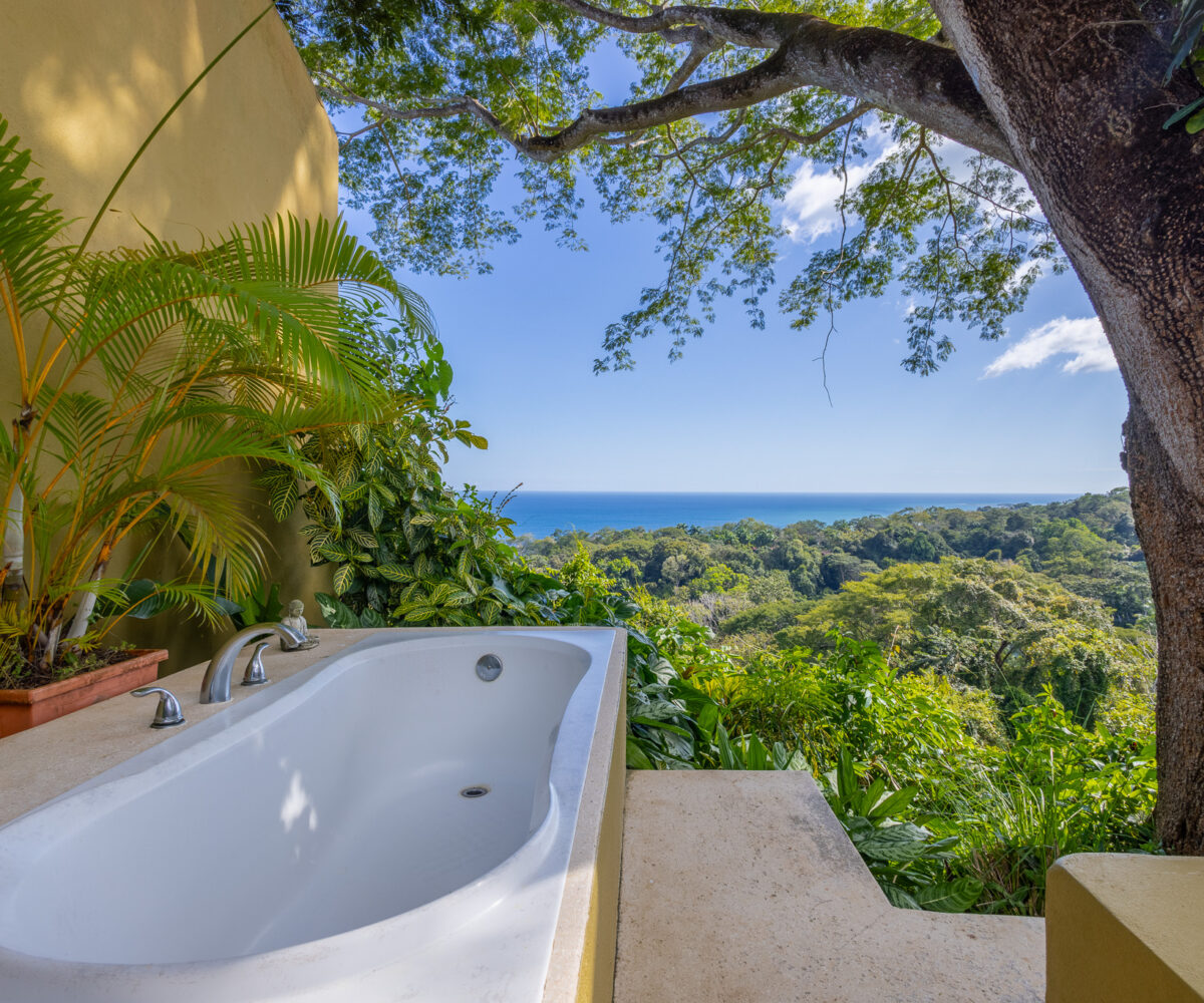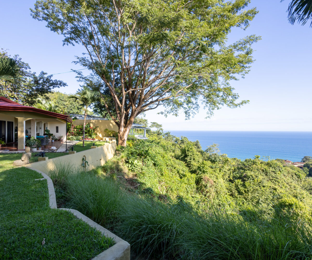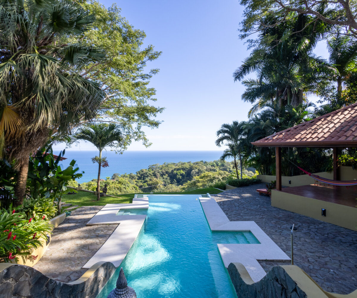 Set high above the vibrant coastal town of Montezuma, this remarkable estate commands panoramic views of the Pacific Ocean framed by lush jungle landscape. Mature tropical gardens surround the property, offering exceptional privacy and a serene, retreat-like atmosphere infused with natural beauty.