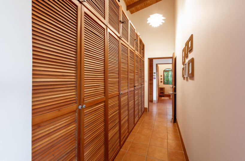The main residence features a spacious primary suite with soaring ceilings and uninterrupted ocean views. The ensuite bathroom is designed for comfort and style, featuring a double vanity and dual showers. A secondary room—currently used as an office—can easily be adapted into a children’s bedroom. Additional amenities include a large utility room, a guest half-bath, and ample built-in storage lining the hallway leading to the primary suite.