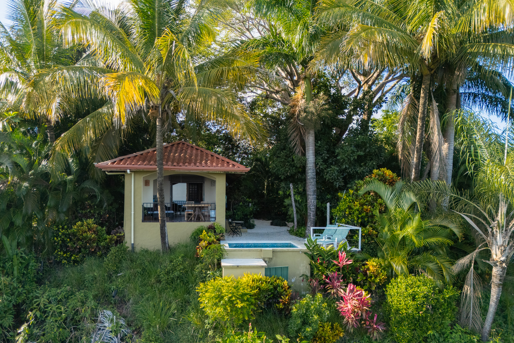 An open-plan kitchen and living area seamlessly connect indoor and outdoor living. Expansive sliding glass doors open onto a generous terrace with a dining area ideal for hosting up to ten guests. An outdoor soaking tub and shower elevate the experience, creating a private spa-like setting where you can unwind while enjoying ocean views and unforgettable jungle sunsets.