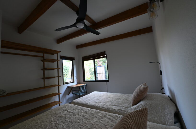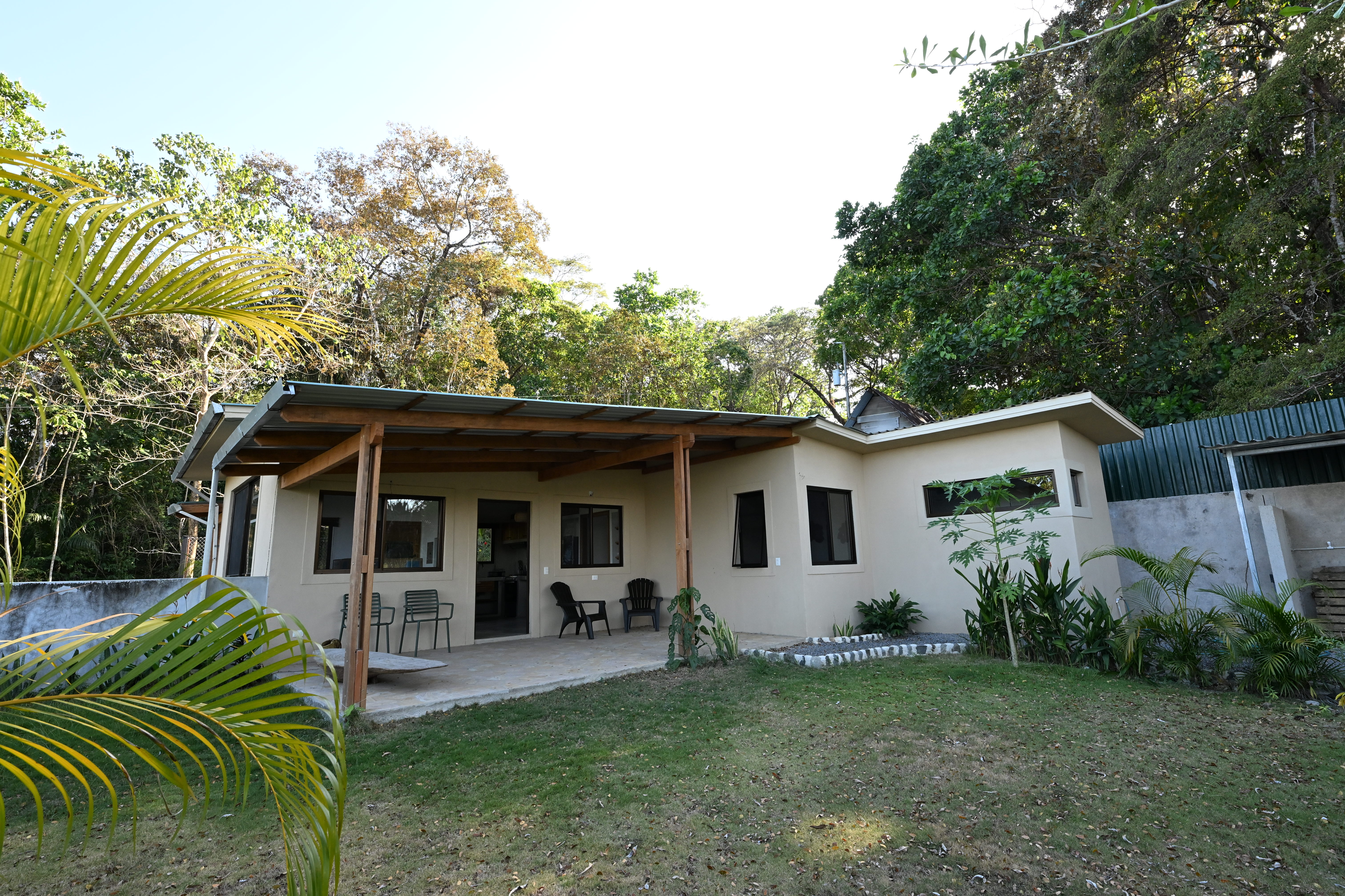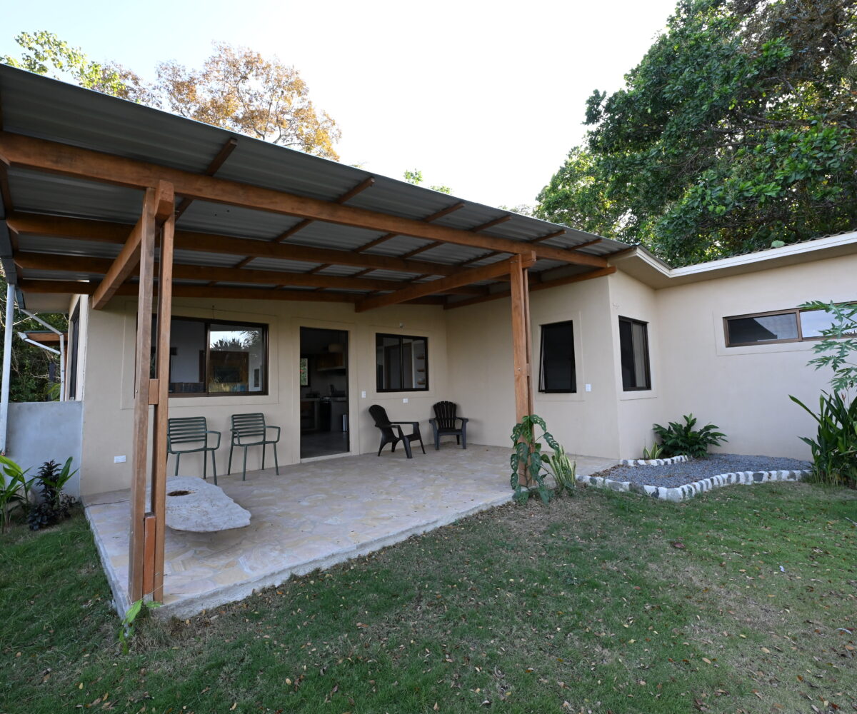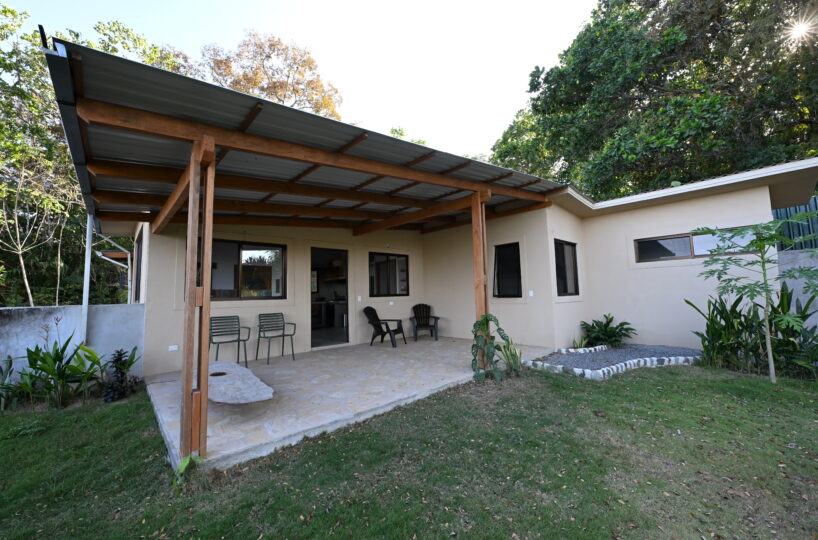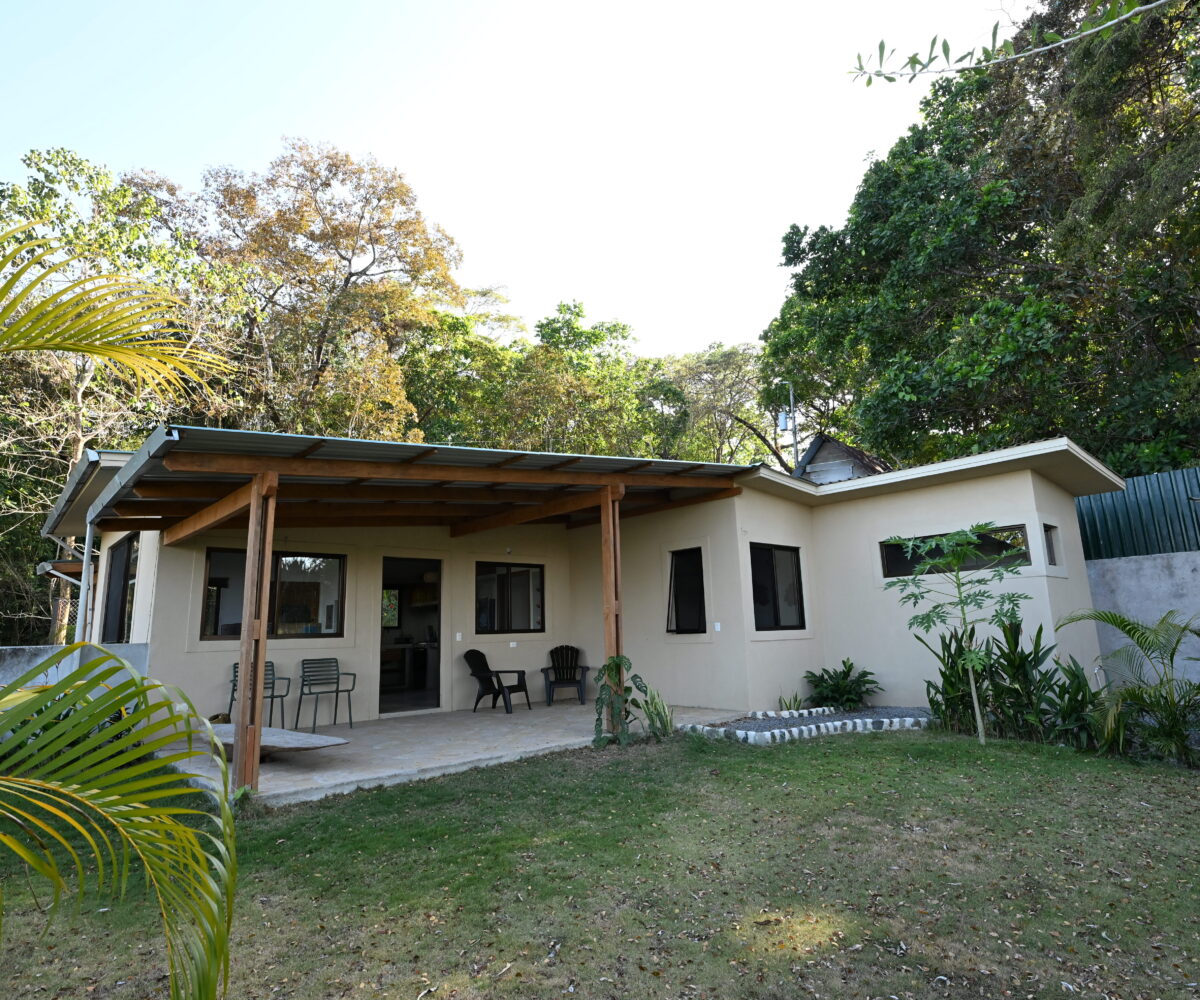 The property sits on a 305 m² lot and features 72 m² of interior space with a total of 96 m² of indoor and outdoor living areas designed for relaxed tropical living. The house offers two comfortable bedrooms, two bathrooms, and an open-concept living room and kitchen that creates a bright and welcoming atmosphere. A covered terrace and private patio extend the living space outdoors, perfect for enjoying the sounds of nature and the refreshing ocean breeze. Because of its exceptional location near the reserve, wildlife sightings are common, including monkeys, birds, and other native animals that frequently pass through the area.