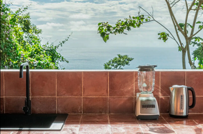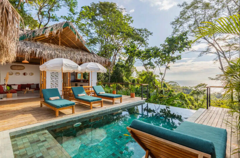 This home boasts an open-concept living and kitchen area with high ceilings and expansive glass doors that seamlessly connect to a large terrace, a swimming pool, and stunning ocean views. The living space is perfect for relaxation and entertainment, featuring a cozy sitting area and a fully equipped kitchen. The home offers generous comfort with three bedrooms, each having its own en-suite bathroom; two bedrooms come with king beds and A/C, while the third is equipped with bunk beds. Enjoy year-round breathtaking Pacific Experience the beauty of indoor-outdoor tropical living in this home with stunning views of the ocean and lush jungle surroundings from the infinity pool.